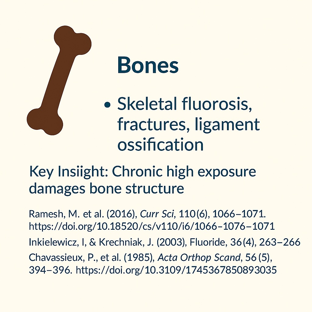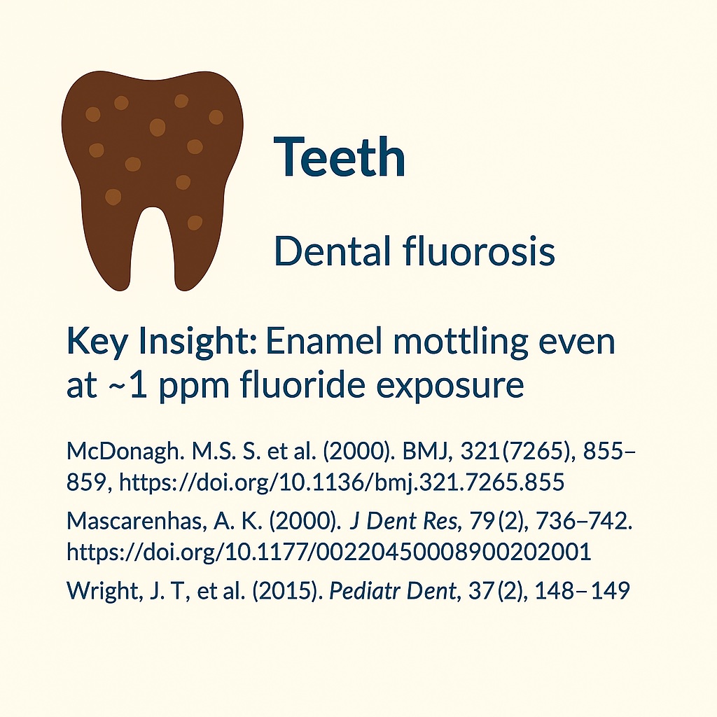 • Topical vs systemic effects: The only proven benefit of fluoride is topical, not systemic. Swallowing it confers no advantage and only increases toxic exposure (Iheozor-Ejiofor et al., 2015).