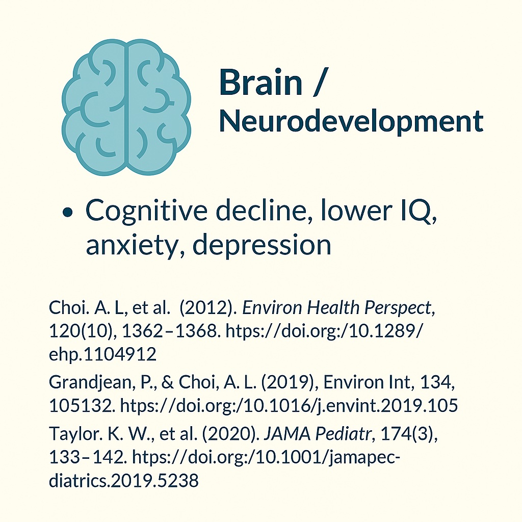 • Neurotoxicity: Over fifty human studies now link fluoride exposure to lowered IQ in children. A 2019 JAMA Pediatrics study found prenatal exposure associated with measurable reductions in cognitive performance at levels typical of U.S. water supplies (Green et al., 2019).